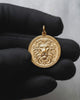 The Lion pendant embodies strength, courage, and noble authority. Crafted in solid gold, this round medallion features a detailed lion's head framed by a classic Greek key border — a symbol of eternal power and protection. With its bold expression and flowing mane, this piece commands presence, making it a powerful statement of leadership and fearlessness.