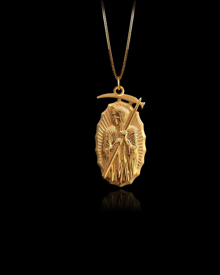 The Santa Muerte pendant is a bold emblem of mortality, justice, and spiritual protection. Crafted in solid gold, it features the cloaked figure of the Holy Death holding a scythe, framed by radiant beams that echo divine power and presence. More than a symbol of death, Santa Muerte stands as a guardian of truth and balance — respected by those who seek strength in endings and reverence in new beginnings.