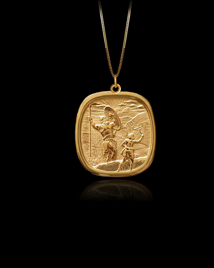 The David and Goliath pendant captures the legendary moment of triumph over impossible odds. Crafted in solid gold, this piece tells the story of unwavering faith and fearless resolve, the young David standing tall against the mighty Goliath. A timeless symbol of inner strength and divine purpose, this pendant speaks to those who rise with courage when the world says retreat. A tribute to resilience, belief, and victory against all odds.