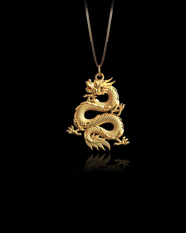 The Gold Dragon pendant embodies strength, wisdom, and transformation. Crafted in solid gold, this intricate design captures the mythical dragon, a symbol of power, protection, and courage. This pendant serves as a meaningful reminder of resilience and the potential for personal growth, making it a unique addition to any collection.