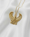 Crafted in solid gold, this pendant features the majestic design of Horus, the ancient Egyptian falcon god, symbolizing the sky and protection. The intricate craftsmanship captures the essence of this revered emblem, making it a meaningful accessory for everyday wear.