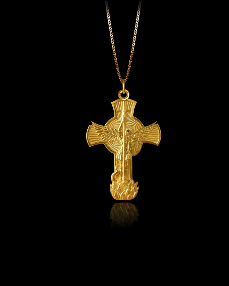 A symbol of divine protection and victorious strength, the Gold St. Michael Cross honours the celestial warrior who defends against darkness and leads with unwavering light. Crafted in solid gold, this powerful piece features Archangel Michael slaying the dragon, set against a radiant cross and a sunburst halo. Every detail is sculpted to reflect strength, justice, and sacred authority. For those who walk with courage and call on higher protection, this pendant is a shield of faith worn close to the heart.