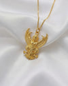 The Garuda pendant captures the spirit of divine strength and protection. Crafted in solid gold, this design features Garuda in mid-flight — wings fully extended and arms lifted in eternal vigilance. His powerful form merges avian grace with human strength, symbolizing the triumph of light over darkness. From the detailed feathers to the ornate chest armour and fierce expression, every element speaks of courage, speed, and devotion. A sacred emblem for those who walk boldly in purpose and truth.