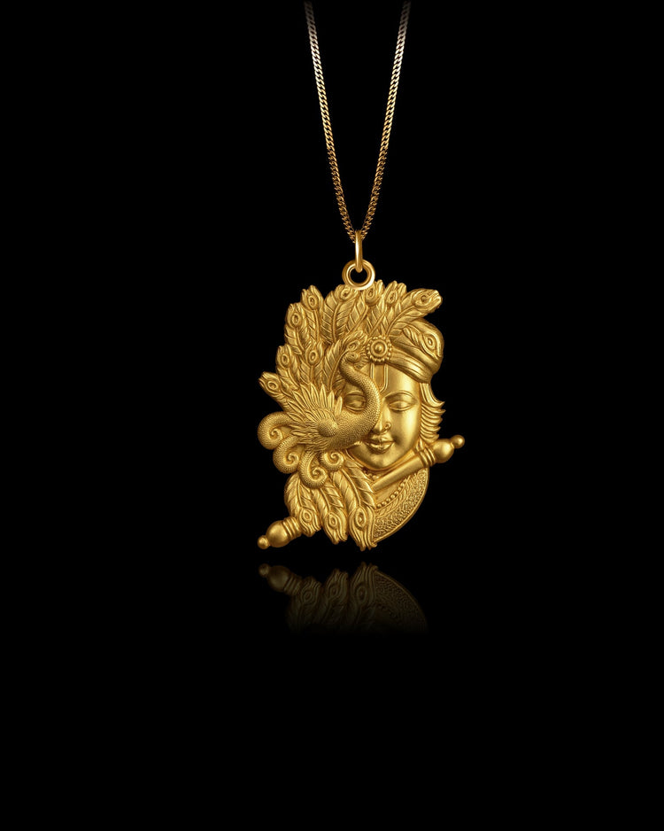 This Krishna pendant captures the divine essence of Lord Krishna, adorned with an intricate peacock and flute motif. Crafted in solid gold, the pendant symbolizes love, wisdom, and spiritual beauty. The expressive details of Krishna’s serene face and the flowing feathers of the peacock create a harmonious blend of elegance and reverence. A meaningful tribute for those drawn to devotion, music, or Indian heritage.