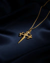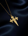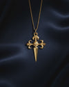 A symbol of fearless faith and sacred rebellion, the Gold Santiago cross fuses warrior strength with spiritual devotion in a striking, gothic form. Crafted in solid gold, this pendant features the legendary Santiago cross—styled as a sword with flared fleur-de-lis ends — and a bold skull motif that evokes memento mori and the eternal battle between darkness and light. It speaks to those who walk their own path with honour, edge, and unwavering conviction.