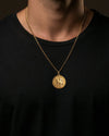 The St George Pendant captures the legendary triumph of courage over darkness. Crafted in solid gold, this round medallion features St George mounted on horseback, vanquishing the dragon beneath him — an enduring emblem of bravery, righteousness, and divine protection. Encircled by a classical border, the design balances strength with timeless elegance. A powerful statement for those who stand boldly for what is right, this pendant is a symbol of fearless conviction and spiritual valour.