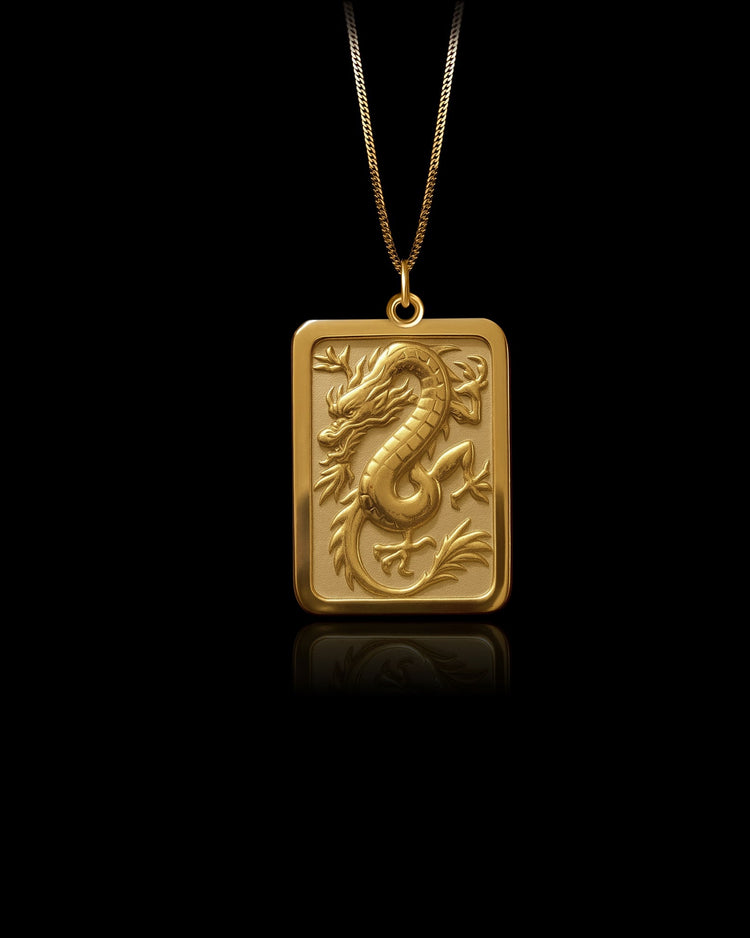 The Dragon pendant embodies strength, wisdom, and transformation. Crafted in solid gold, this intricate design captures the mythical dragon, a symbol of power, protection, and courage. This pendant serves as a meaningful reminder of resilience and the potential for personal growth, making it a unique addition to any collection.