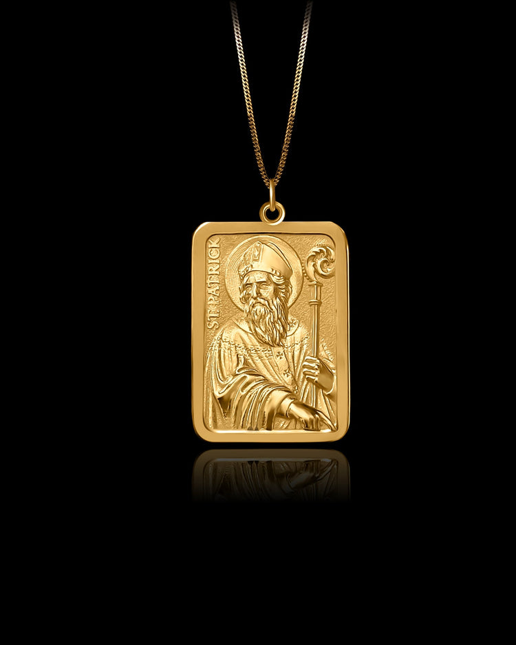 The St Patrick pendant represents protection and spirit. Crafted in solid gold, this pendant features St Patrick, the patron of Ireland, symbolizing the triumph of good over evil.