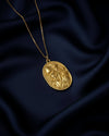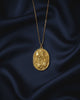 The Santa Muerte pendant is a powerful symbol of mortality, transformation, and spiritual protection. Crafted in solid gold, this oval pendant features the cloaked skeletal figure of La Santa Muerte surrounded by blooming roses — representing the delicate balance between life and death. The contrast of smooth surfaces and finely textured background enhances the mystique of the design. With every curve and contour, the pendant evokes reverence, fearlessness, and deep respect for the cycles of existence. A piece for those who walk their own path, embracing the unknown with courage and grace.