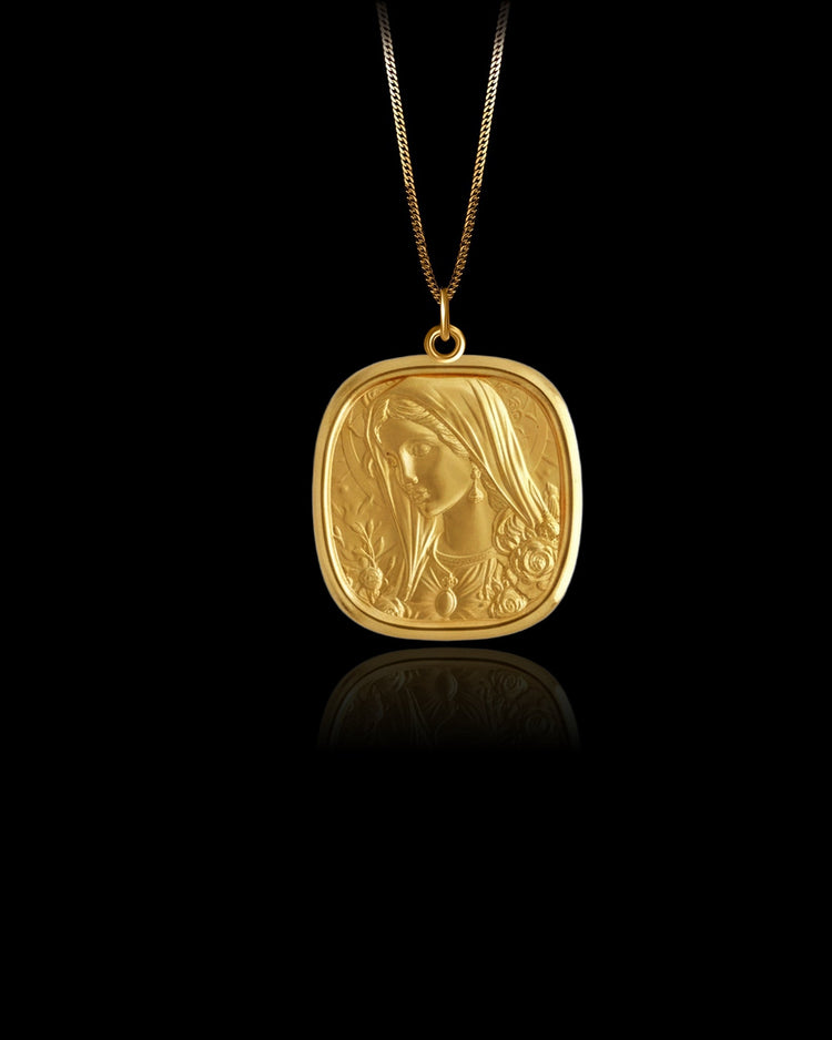 A portrait of serenity and grace, the Virgin Mary pendant captures the tender beauty of the Holy Mother. Crafted in solid gold in America, this pendant features a delicate depiction of the Virgin Mary framed by blooming flowers, symbols of purity, compassion, and divine love. Her peaceful gaze and detailed veil speak to those seeking protection and inner strength. A sacred keepsake and elegant tribute to the, this piece of jewellery radiates warmth and reverence.