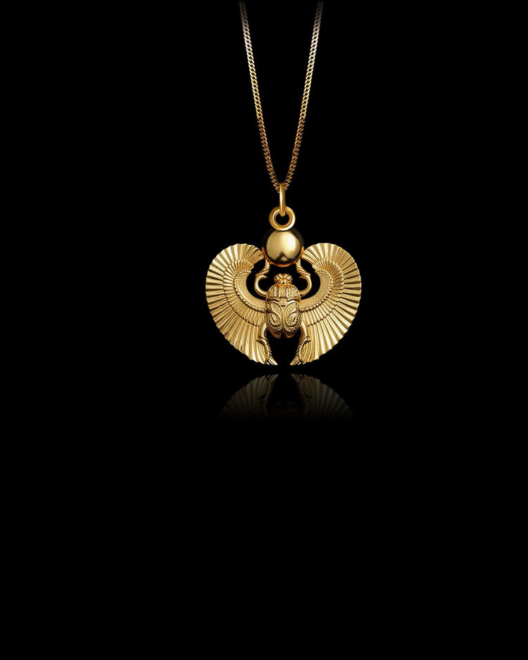 A sacred emblem of renewal, transformation, and eternal life, the Gold Scarab pendant draws from ancient Egyptian tradition to channel protection and inner power. Crafted in solid gold, this pendant features a stylized scarab beetle with intricately sculpted wings and bold symmetry. Inspired by timeless amulets worn by pharaohs and warriors, it represents the rising sun and the soul’s journey through cycles of rebirth. Worn as a talisman, it offers strength, clarity, and spiritual grounding.
