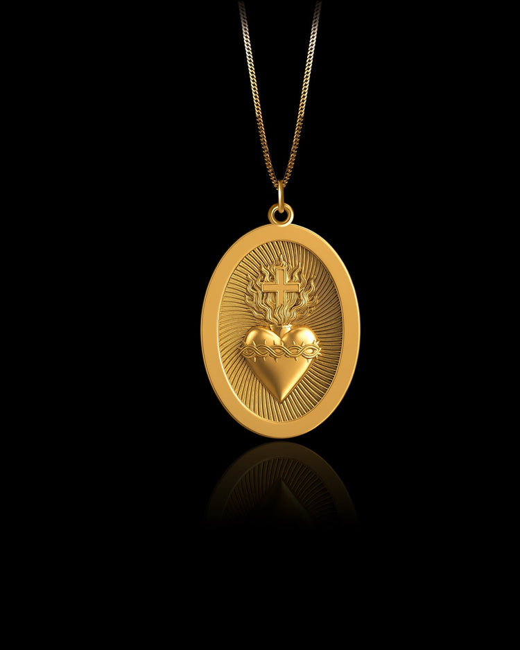 The Gold Sacred Heart Pendant represents divine love, faith, and protection. Crafted in solid gold, this pendant features the iconic Sacred Heart design, symbolizing unwavering devotion and spiritual connection. A timeless emblem of compassion, it serves as a reminder of love, sacrifice, and the strength of faith.
