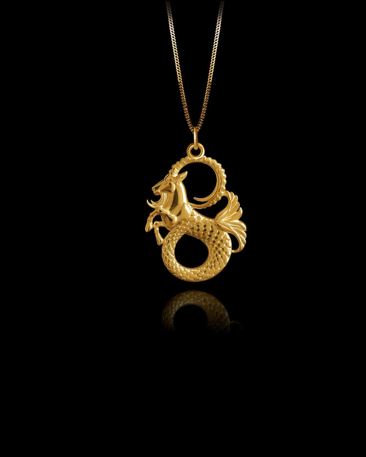 A symbol of ambition, endurance, and ancient wisdom, the Capricorn pendant channels the fierce determination and grounded strength of the legendary sea goat. Crafted in solid gold, this striking design blends the form of a powerful mountain goat with the coiled tail of a mythical sea creature, capturing the duality of Capricorn’s earth and water energies with sculptural precision. It resonates with those who climb steadily toward their goals while staying deeply rooted in intuition and purpose.