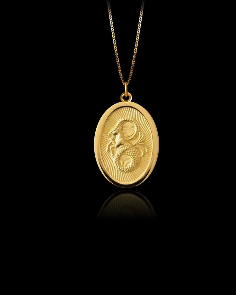 The Capricorn pendant reflects ambition, perseverance, and mastery. Crafted in solid gold, this elegant medallion features the mythic sea-goat — a creature that embodies the balance between grounded discipline and intuitive depth. Symbolizing hard-earned success and resilience, this piece is perfect for those born under the Capricorn sign or anyone who carves their own path through dedication and strength. Its smooth finish and sharp detail offer a bold yet refined look that speaks to inner power.