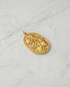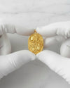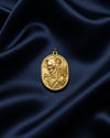 The Santa Muerte pendant is a powerful symbol of mortality, transformation, and spiritual protection. Crafted in solid gold, this oval pendant features the cloaked skeletal figure of La Santa Muerte surrounded by blooming roses — representing the delicate balance between life and death. The contrast of smooth surfaces and finely textured background enhances the mystique of the design. With every curve and contour, the pendant evokes reverence, fearlessness, and deep respect for the cycles of existence. A piece for those who walk their own path, embracing the unknown with courage and grace.